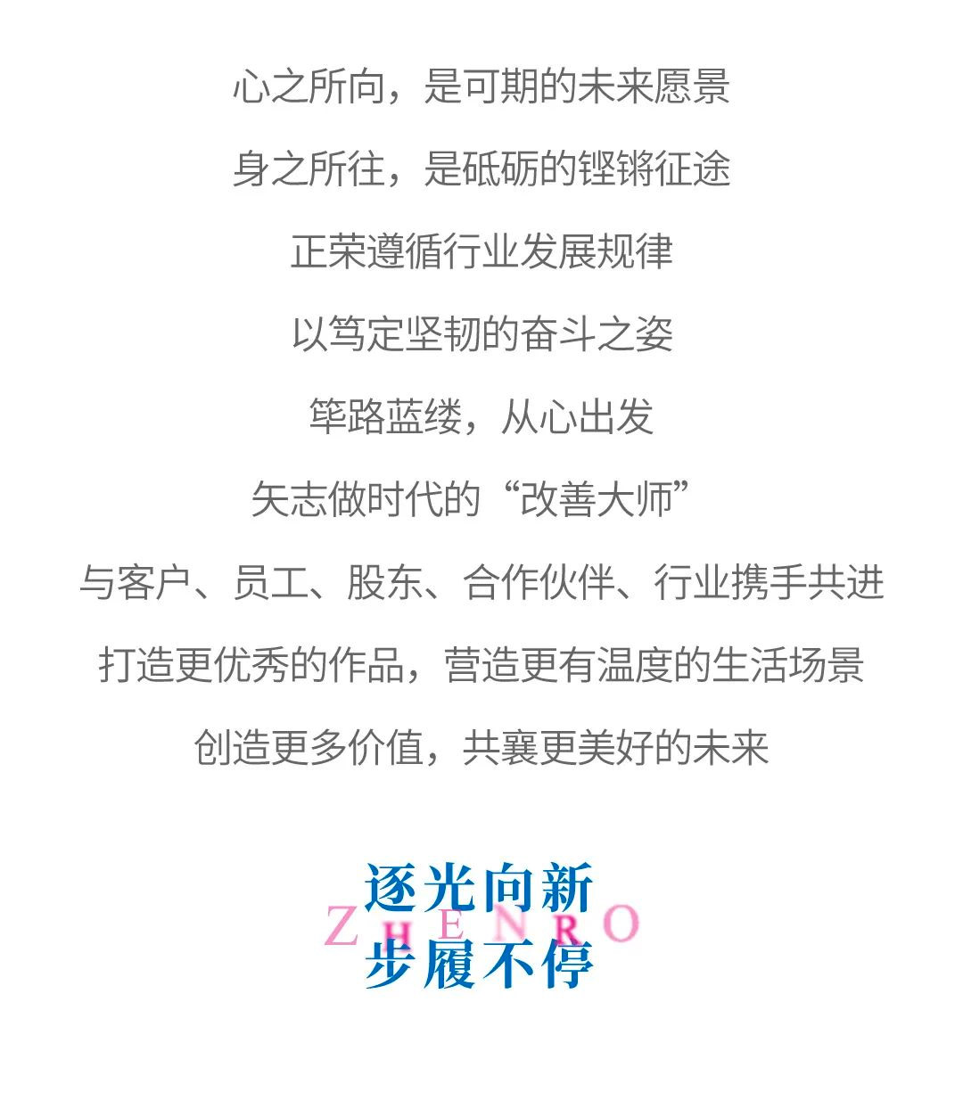 正荣成立23年以来,始终坚持“正直构筑繁荣”的核心价值观,始终朝着“打造百年正荣,助力社会繁荣”的使命愿景不懈追求,始终坚守“正品立世、厚德长荣”的经营理念不动摇,这些价值准则,引领了正荣23年来的蓬勃发展,我们也坚定地相信,它将指引正荣在变化的行业周期中穿越激流,走向未来。